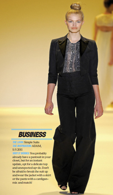 Esta revista pense que iba a ser una revista con moda informal pero encuentro que esta llena de looks formales como para oficina o congresos y eventos sociales semi formales. Esto me puso a pensar en lo importante que es la transición del colegio a la universidad donde uno debería de dirigir su vestimenta a looks que puedas usar para estos eventos y no tener sólo un pantalón formal que adoras o que te queda super y que le das tan duro que ya le falta poco para decirte adiós. Cuando encuentres prendas que adoras no hagas el típico me lo pongo tanto que parezco retrato, NO cuída la prenda, lávala a mano o llevala a la tintoreria. Así te durará más y será una prenda que te acompañara por mucho tiempo.
